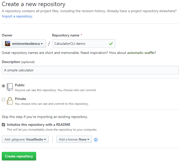 First, we will be creating a Github repository, so reach over to Github and create the repository and the clone it to your local environment. I decided to call this new repository CalculatorCLI-demo.