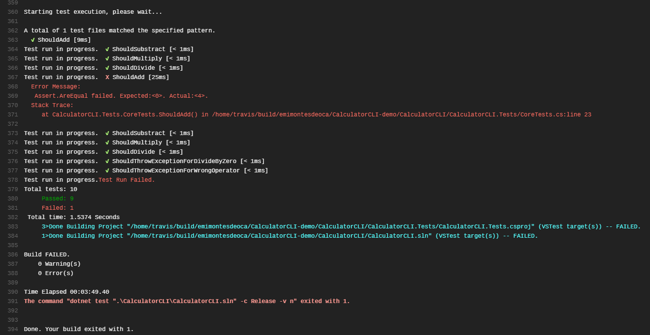 Now let’s go to TravisCI logs and we will see that we successfully broke the project, because the integration test are failing and the build status is error.