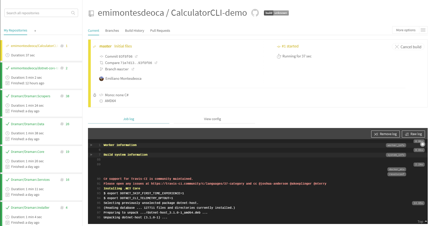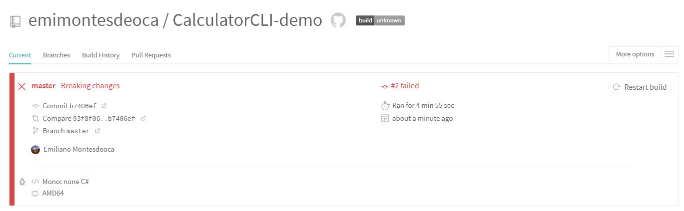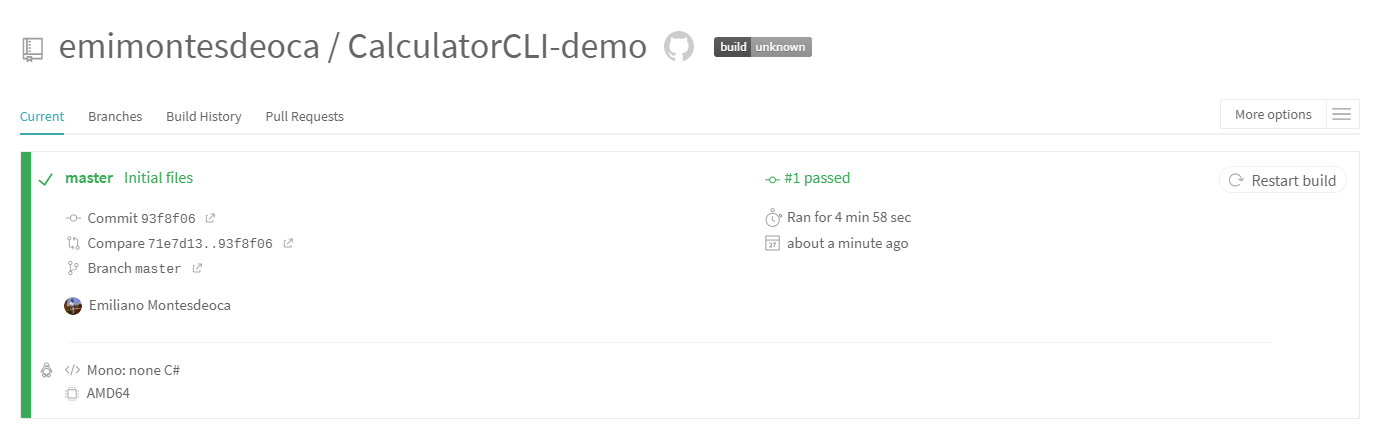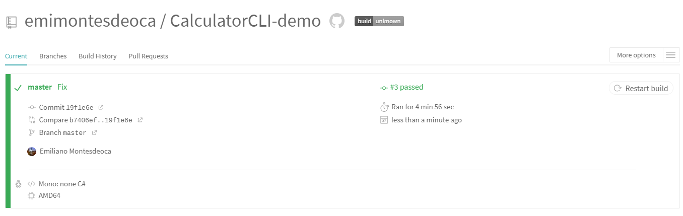 Now make a commit of this change and push it to master, and wait for the results from the TravisCI agent.