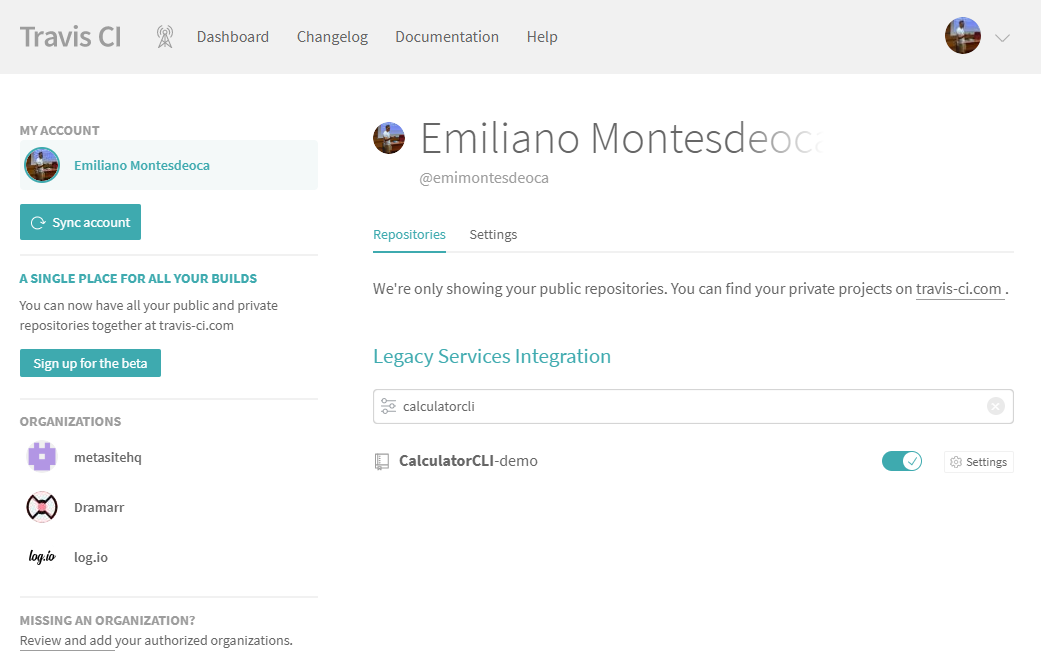 There are some steps that we have to here, but first we are going to link our Github repository to be listened by the TravisCI agents in order to build and test our project.