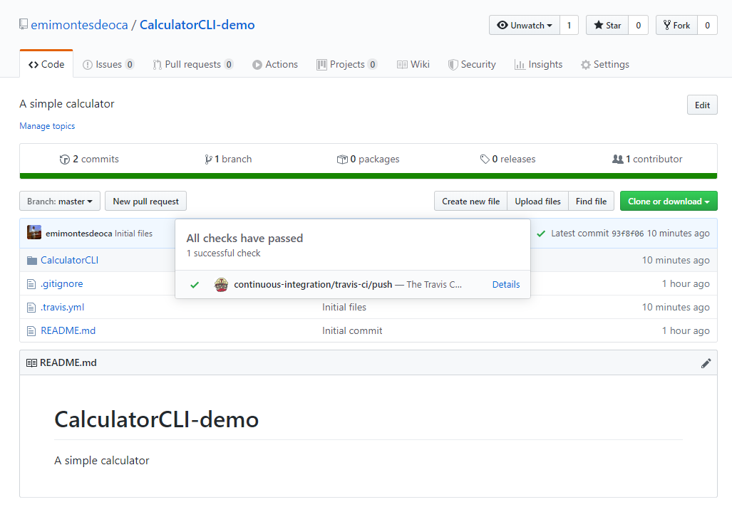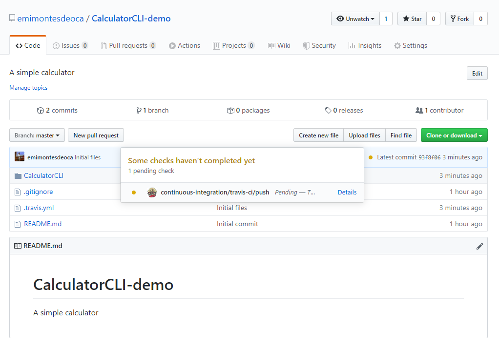 We can check the CI status of the push to master that we did in in both the repository page or the TravisCI dashboard.