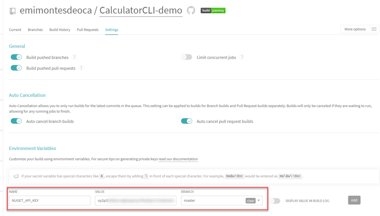 Go to your repository build’s settings and add a new environment variable, called NUGET_API_KEYwith the value being the copied api key from the NuGet page.