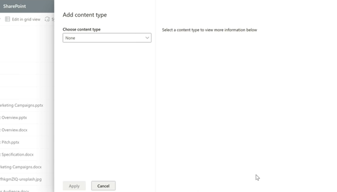 Podremos añadir nuevas columnas y elegir "tipo de contenido". Como se muestra en la captura inferior, en dicho panel podrás seleccionar el tipo de contenido para la lista o biblioteca, y a continuación seleccionar "Aplicar".